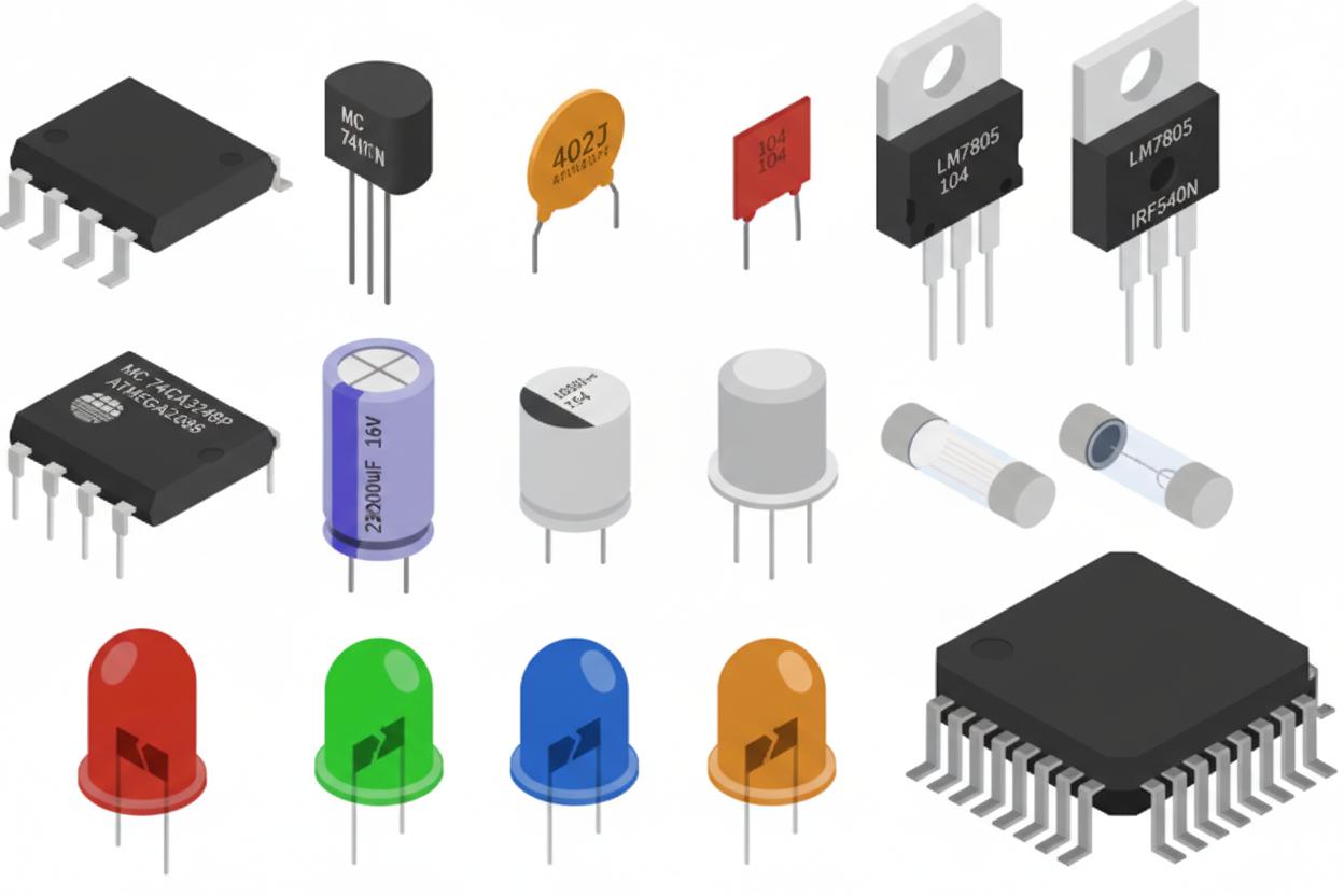 | Electrical components | Resistors, capacitors, ICs, diodes, transistors, sensors | Control, compute, store, protect, sense | Wrong ratings, ESD damage, heat drift, counterfeit sourcing |